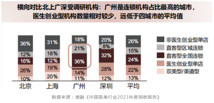 根據(jù)德勤報(bào)告的數(shù)據(jù)顯示,廣州是連鎖機(jī)構(gòu)占比最高的城市,醫(yī)生創(chuàng)業(yè)型機(jī)構(gòu)數(shù)量相對較少,遠(yuǎn)低于北上廣深四城市的平均值。