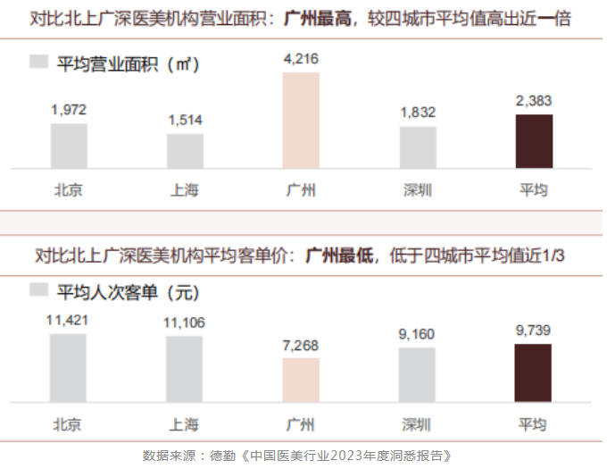 但大營業(yè)面積與低客單價(jià)的結(jié)合也使得廣州醫(yī)美機(jī)構(gòu)的坪效比數(shù)據(jù)不佳。在大灣區(qū)中,廣州醫(yī)美消費(fèi)次數(shù)最高,但客單價(jià)卻低于佛山和深圳,醫(yī)美消費(fèi)者價(jià)格敏感度高。
