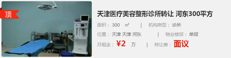 1. 天津醫(yī)療美容整形診所轉(zhuǎn)讓:位于天津河東區(qū),面積為300㎡,是一家診所類型的機構(gòu)。月租金為2萬元,轉(zhuǎn)讓費面議。