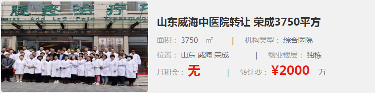 3. 山東威海中醫(yī)院轉(zhuǎn)讓:位于山東威海榮成市,面積為3750㎡,是一家綜合醫(yī)院類型的機構(gòu)。轉(zhuǎn)讓費為2000萬元,月租金未提供。該醫(yī)院提供多種科室和服務(wù)。