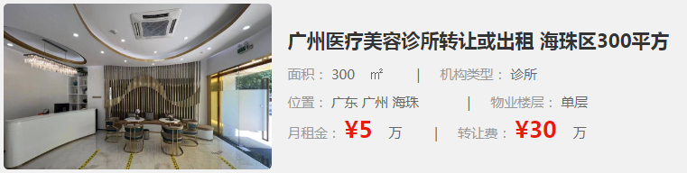 4. 廣州醫(yī)療美容診所轉(zhuǎn)讓或出租:位于廣東廣州海珠區(qū),面積為300㎡,是一家診所類型的機構(gòu)。月租金為5萬元,轉(zhuǎn)讓費為30萬元。
