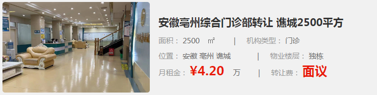 6. 安徽亳州綜合門診部轉(zhuǎn)讓:位于安徽亳州譙城,面積為2500㎡,是一家門診類型的機構(gòu)。月租金為4.20萬元,轉(zhuǎn)讓費面議。