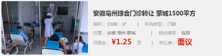 7. 安徽亳州綜合門診轉(zhuǎn)讓:位于安徽亳州蒙城,面積為1500㎡,是一家門診類型的機構(gòu)。月租金為1.25萬元,轉(zhuǎn)讓費面議。