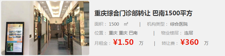 8. 重慶綜合門診部轉(zhuǎn)讓:位于重慶巴南,面積為1500㎡,是一家綜合醫(yī)院類型的機構(gòu)。月租金為1.50萬元,轉(zhuǎn)讓費為360萬元。
