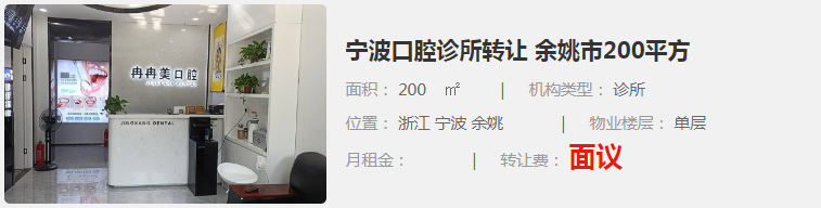9. 寧波口腔診所轉(zhuǎn)讓:位于浙江寧波余姚市,面積為200㎡,是一家診所類型的機構(gòu)。月租金和轉(zhuǎn)讓費面議。