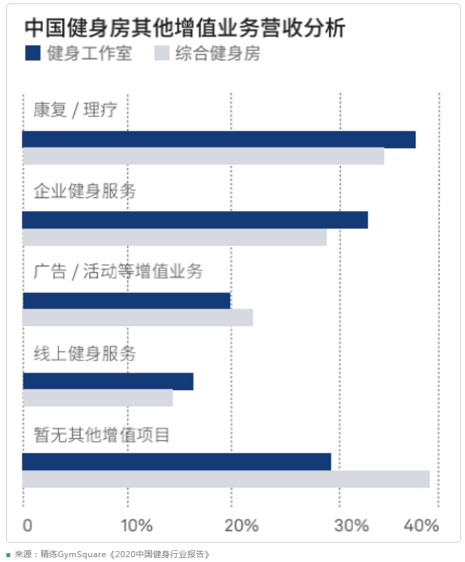 根據(jù)精練GymSquare《2020中國健身行業(yè)報告》數(shù)據(jù),在各類健身房的其他收入占比中, 康復理療占據(jù)比較重要的部分,健身房和工作室在這一部分的收入占比分別為 36.7% 和 33.8%。