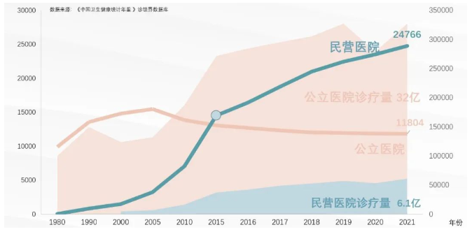 據(jù)國家衛(wèi)健委2021年統(tǒng)計,2021年底我國民營醫(yī)院數(shù)量為2.4萬家,診療量占比6.1億人次。在數(shù)量占據(jù)優(yōu)勢,但診療量上、床位規(guī)模上和公立醫(yī)院有著較大差距。