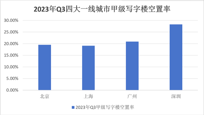 根據(jù)第一太平戴維斯的數(shù)據(jù),2023年第三季度深圳甲級(jí)寫字樓全市的空置率環(huán)比上升了1.3個(gè)百分點(diǎn)至28.3%,遠(yuǎn)高于北京的19.5%、上海的19.1%以及廣州的20.9%。