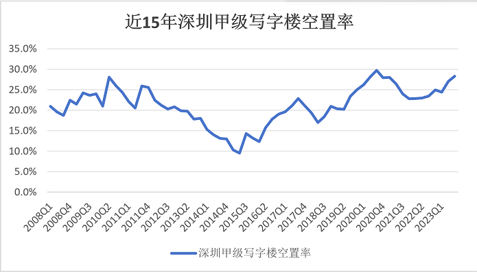 據(jù)記者觀察,2023年第三季度深圳甲級(jí)寫字樓空置率為近15年來的次新高,僅次于2020年第三季度29.7%的空置率。