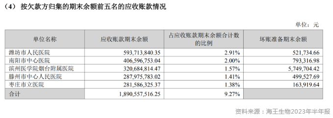 比如,海王生物排名前五的欠款方,均為醫(yī)院。至2023年6月底,五家醫(yī)院中每家的欠款余額歸在2.81億元以上。