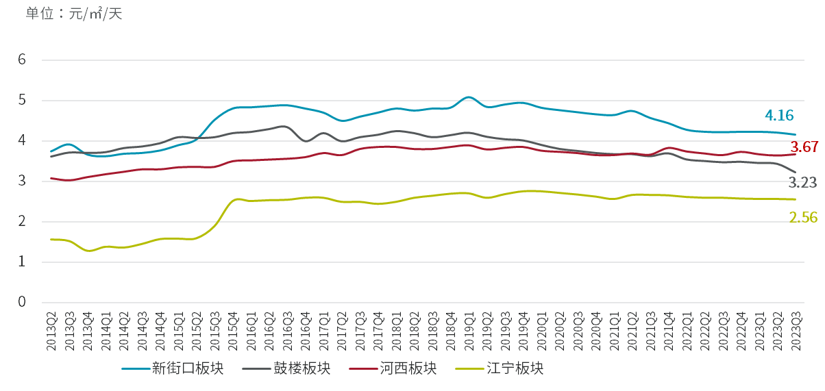 在三季度,南京寫(xiě)字樓市場(chǎng)的租金水平出現(xiàn)了一定的波動(dòng),但總體來(lái)說(shuō),其租金水平仍然處于穩(wěn)定狀態(tài)。在河西板塊新入市項(xiàng)目的逐漸去化影響下,河西區(qū)域的租金價(jià)格止跌微升。同時(shí),由于新街口區(qū)域與河西區(qū)域的租金差距逐漸縮小,河西區(qū)域的租金價(jià)格也呈現(xiàn)出微升趨勢(shì)。