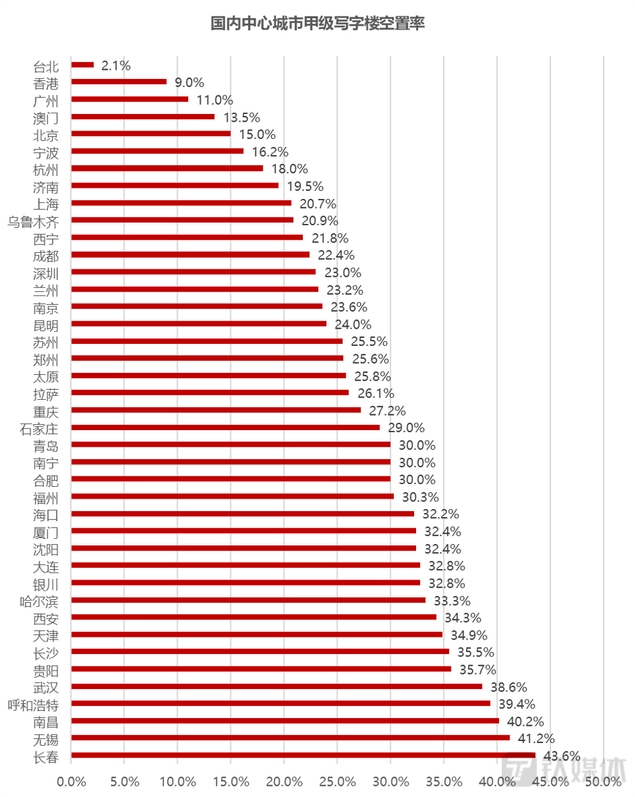 此外,根據(jù)仲量聯(lián)行的數(shù)據(jù),2022年我國(guó)41個(gè)中心城市的甲級(jí)寫字樓空置率數(shù)據(jù)中,只有臺(tái)北和香港的空置率低于10%,其余39個(gè)城市甲級(jí)寫字樓空置率都超過(guò)10%,其中25個(gè)城市的空置率超過(guò)25%,長(zhǎng)春的空置率最高,達(dá)到驚人的43.6%。