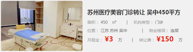1、蘇州醫(yī)療美容門診轉(zhuǎn)讓(吳中):該門診位于江蘇蘇州吳中區(qū),面積450平方米,物業(yè)樓層為連層。月租金為¥3萬,轉(zhuǎn)讓費為¥150萬。這個門診部提供美容外科和美容皮膚科服務(wù)。