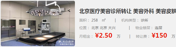 2、北京醫(yī)療美容診所轉(zhuǎn)讓(美容外科、美容皮膚):該診所位于北京大興區(qū),面積258平方米,物業(yè)樓層為連層。月租金為¥2.50萬,轉(zhuǎn)讓費為¥150萬。這個診所提供美容外科和美容皮膚服務(wù)。