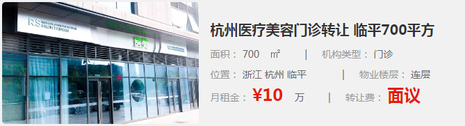 3、杭州醫(yī)療美容門診轉(zhuǎn)讓(臨平):該門診位于浙江杭州臨平區(qū),面積700平方米,物業(yè)樓層為連層。月租金為¥10萬,轉(zhuǎn)讓費面議。這個門診部提供美容外科和美容皮膚科服務(wù)。