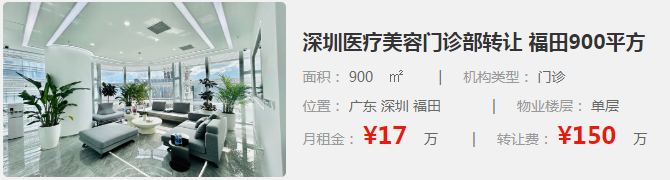 4、深圳醫(yī)療美容門診部轉(zhuǎn)讓(福田):該門診位于廣東深圳福田區(qū),面積900平方米,物業(yè)樓層為單層。月租金為¥17萬,轉(zhuǎn)讓費為¥150萬。這個門診部提供美容外科和美容皮膚科服務(wù)。