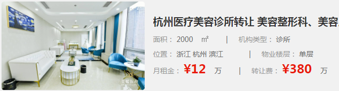 6、杭州醫(yī)療美容診所轉(zhuǎn)讓(美容整形科、美容皮膚科):該診所位于浙江杭州濱江區(qū),面積2000平方米,物業(yè)樓層為單層。月租金為¥12萬,轉(zhuǎn)讓費為¥380萬。這個診所提供美容整形科和美容皮膚科服務(wù)。