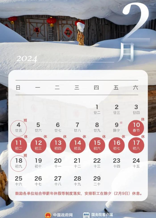 二、春節(jié):2月10日至17日放假調(diào)休,共8天。2月4日(星期日)、2月18日(星期日)上班。鼓勵(lì)各單位結(jié)合帶薪年休假等制度落實(shí),安排職工在除夕(2月9日)休息。