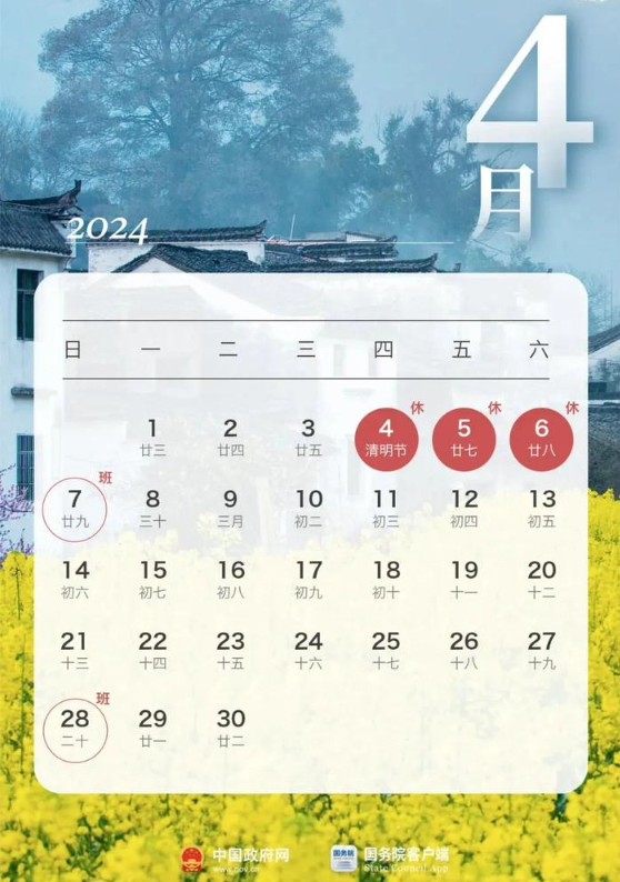 三、清明節(jié):4月4日至6日放假調(diào)休,共3天。4月7日(星期日)上班。