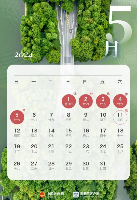 四、勞動(dòng)節(jié):5月1日至5日放假調(diào)休,共5天。4月28日(星期日)、5月11日(星期六)上班。