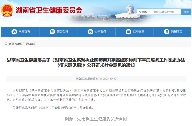 10月19日,湖南衛(wèi)健委發(fā)布關(guān)于《湖南省衛(wèi)生系列執(zhí)業(yè)醫(yī)師晉升副高級(jí)職稱前下基層服務(wù)工作實(shí)施辦法(征求意見稿)》,征求意見稿中對(duì)于醫(yī)生晉升下基層,予以了明確的規(guī)定。