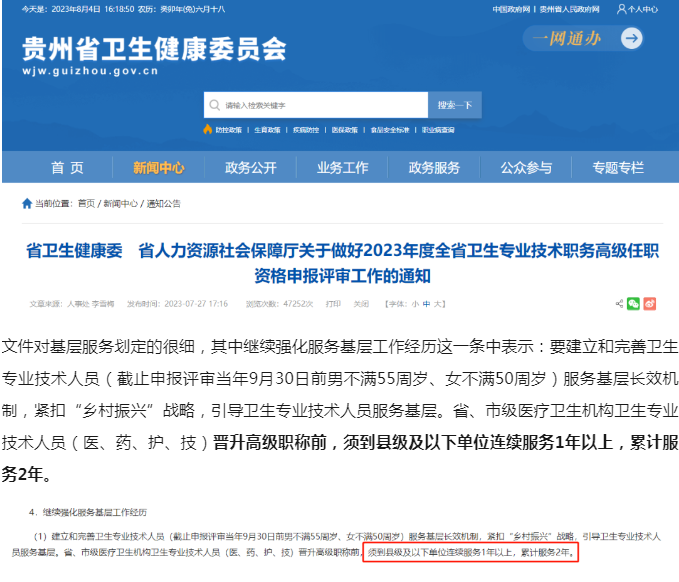2023年7月27日,貴州省衛(wèi)健委下發(fā)了《關(guān)于做好2023年度全省衛(wèi)生專業(yè)技術(shù)職務(wù)高級(jí)任職資格申報(bào)評(píng)審工作的通知》。