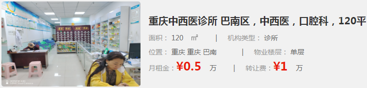 該診所位于重慶巴南區(qū),面積約為120平方米,機構(gòu)類型為中西醫(yī)診所。物業(yè)為單層,月租金約為¥0.5萬。轉(zhuǎn)讓費¥1萬。