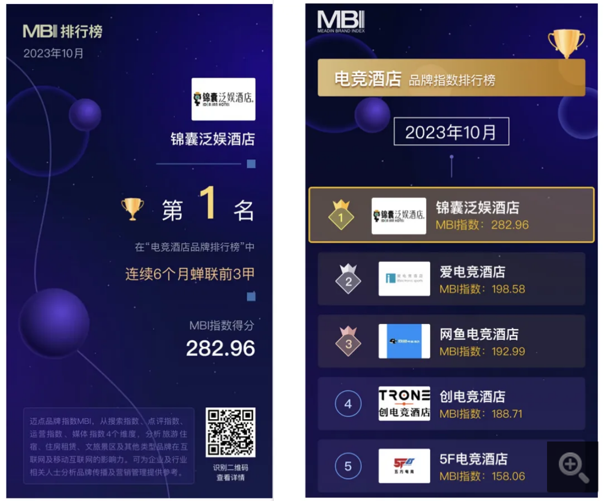 唯一上百強榜的電競酒店品牌:錦囊泛娛酒店排名74。