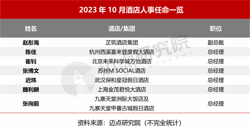 酒店人事任命:據(jù)邁點研究院不完全統(tǒng)計,2023年10月共有19位高管履新,其中涉及四季酒店集團、香格里拉、萬豪酒店等數(shù)個奢華、高端酒店集團及品牌。