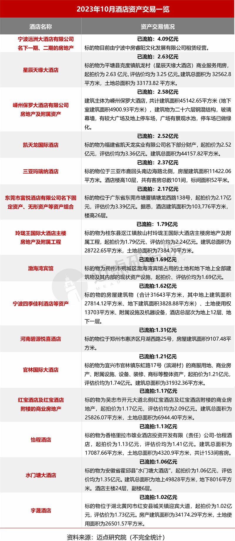 據(jù)邁點研究院不完全統(tǒng)計,2023年10月,共有48家酒店拍賣,其中拍賣價格在億元以上酒店15家,拍賣價格在5000萬元-1億元酒店8家,拍賣價格5000萬元以下25家,截至發(fā)稿,只有1家酒店已成交。