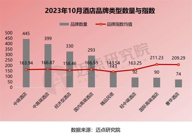 酒店品牌簽約:據(jù)邁點研究院不完全統(tǒng)計,2023年10月中國酒店市場新簽約項目97家。品牌類型上,奢華酒店簽約3家、國際高端酒店簽約5家、國內(nèi)高端酒店簽約2家、中高端酒店簽約35家、中端酒店簽約12家、輕中端酒店簽約8家、經(jīng)濟型酒店簽約14家、精品民宿簽約18家。