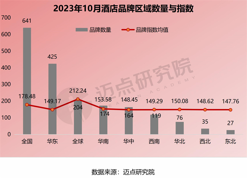 品牌指數(shù)均值維度分析:10月區(qū)域指數(shù)最高值(全球指數(shù)均值)出現(xiàn)下滑現(xiàn)象,環(huán)比下跌2.60%,其他區(qū)域浮動率均在-0.51%~0.27%左右,且下降率高于增長率,這表明從區(qū)域維度看,整體行業(yè)品牌發(fā)展不容樂觀,尤其是對于全球酒店而言,品牌發(fā)展需進一步強化。