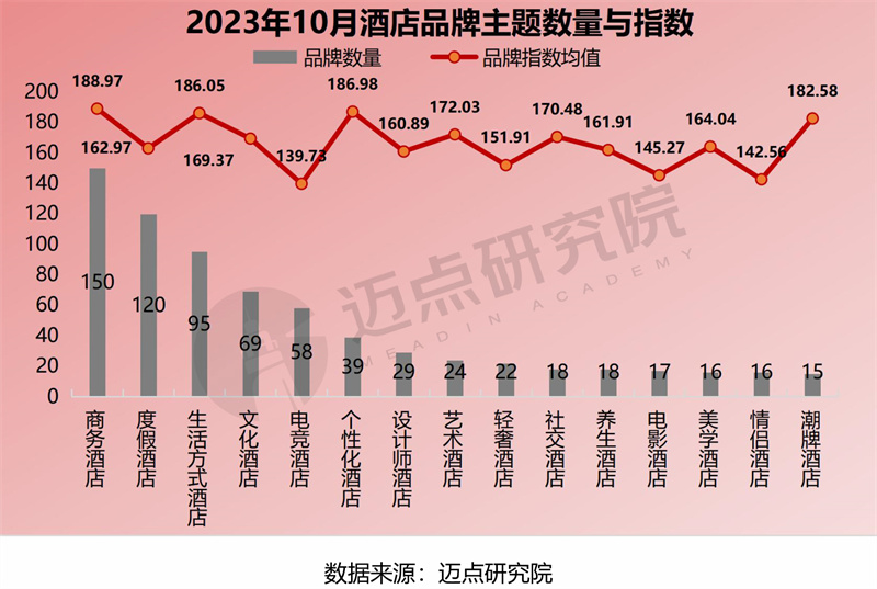 品牌數(shù)量維度分析:10月電競酒店和生活方式酒店為增長數(shù)值最大的2個主題酒店品牌,分別增長4、2家,環(huán)比增長7.41%和2.15%,這表明目前發(fā)展新型主題酒店,一定程度上已被酒店市場所認(rèn)可?;诖耍~點研究院認(rèn)為新型主題酒店未來將會有巨大的發(fā)展前景,尤其是切合客群實際需求的主題酒店。