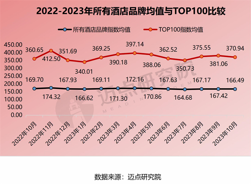 10月百強榜單和整體酒店品牌指數(shù)數(shù)據(jù)如下,TOP100品牌指數(shù)均值為370.94,環(huán)比下降
