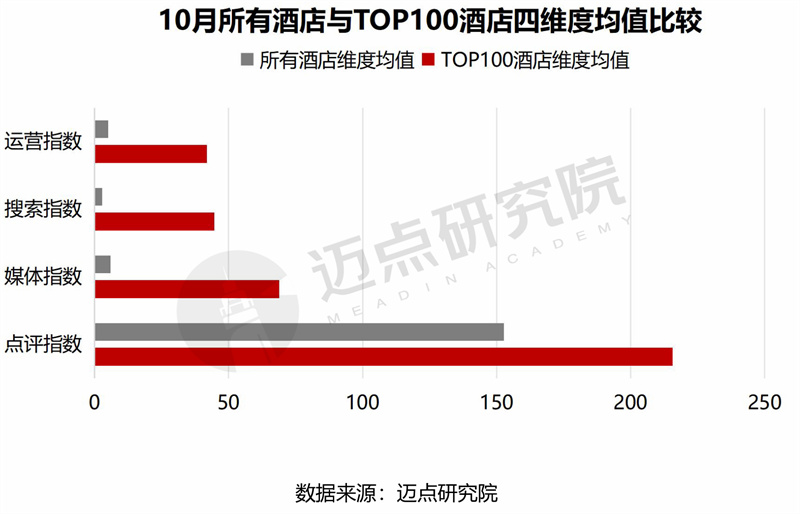 通過下圖數(shù)據(jù)可知,TOP100酒店維度均值分別為點評指數(shù)(215.66)、媒體指數(shù)(68.78)、搜索指數(shù)(44.61)、運營指數(shù)(41.89),所有酒店維度均值分別為點評指數(shù)(152.77)、媒體指數(shù)(5.95)、運營指數(shù)(4.98)、搜索指數(shù)(2.79)。