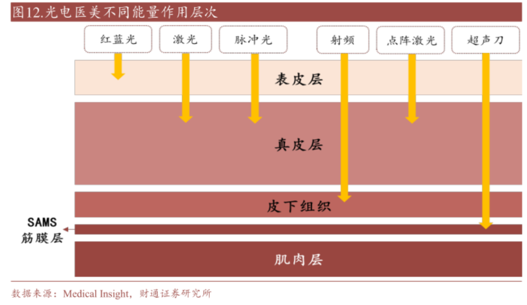 光電醫(yī)美設備(又稱“能量源設備”)的原理是將激光、射頻、超聲等能量形式作用于皮膚,達到醫(yī)美效果,產品也以上述三種原理進行分類。其中,激光類設備包括脈沖光(光子嫩膚)、激光(皮秒、點陣等),主要用于嫩膚、脫毛、祛斑等基礎美容;射頻類設備包括“熱瑪吉”“熱拉提”等;超聲波類產品包括超聲(超聲刀),多用于進階需求抗衰、減脂等。