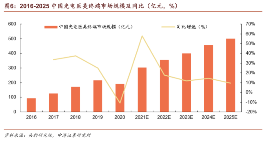 據(jù)頭豹研究院對市場規(guī)模的測算數(shù)據(jù),中國光電類醫(yī)美市場規(guī)模從2016年的93.61億元增長至2019年的216.01億元,復合年均增長率達31.94%,2020年受疫情影響收縮至191.73億元。中泰證券研究所認為,隨著疫情得到控制,我國光電醫(yī)美行業(yè)市場規(guī)模將迅速恢復,預計到2022年,該行業(yè)市場規(guī)模將超過350億元。