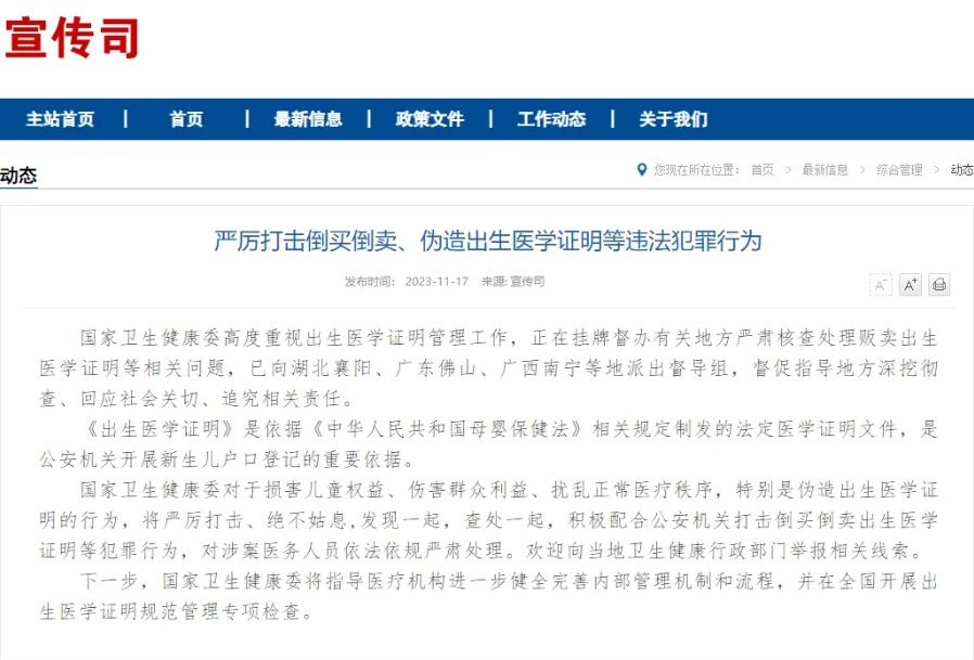 國家衛(wèi)生健康委高度重視出生醫(yī)學證明管理工作,正在掛牌督辦有關地方嚴肅核查處理販賣出生醫(yī)學證明等相關問題,已向湖北襄陽、廣東佛山、廣西南寧等地派出督導組,督促指導地方深挖徹查、回應社會關切、追究相關責任。
