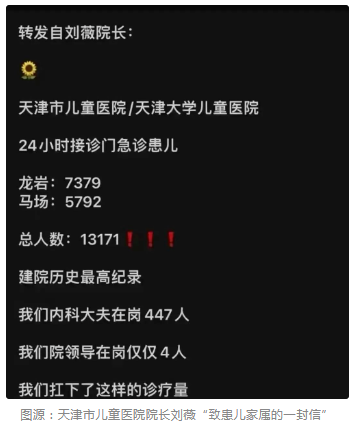 最近天津市兒童醫(yī)院兩個院區(qū)日門急診量加起來已經(jīng)超過12000人次。據(jù)網(wǎng)傳天津市兒童醫(yī)院院長劉薇“致患兒家屬的一封信”內(nèi)容顯示,11月18日該院旗下2個院區(qū)門診量累計單日突破13171人次,連續(xù)百余天日門急診量破萬。天津市兒童醫(yī)院主任醫(yī)師、呼吸感染科專家鄒映雪介紹說,醫(yī)護人員全天24小時不間斷地在接診,最多的時候兩院區(qū)夜間診室的醫(yī)生加起來將近40人,但仍有部分患者要等候一段時間才能看上。
