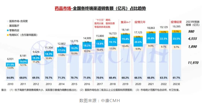 根據(jù)中康CMH數(shù)據(jù),在醫(yī)改政策推動(dòng)下,零售終端占比持續(xù)擴(kuò)大,預(yù)計(jì)2023年藥品零售線下市場(chǎng)占比達(dá)到23.5%,其中電商占比由2020年的3%提升到5.1%,電商渠道市場(chǎng)空間正被越來越多藥商所重視。