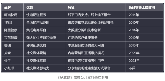 綜合而言,專業(yè)醫(yī)藥平臺(tái)先發(fā)優(yōu)勢(shì)明顯,阿里、京東和美團(tuán)在供應(yīng)鏈、倉(cāng)儲(chǔ)物流、城市覆蓋范圍及應(yīng)用場(chǎng)景方面更具優(yōu)勢(shì),抖音、快手、小紅書雖然在這一賽道起步晚,但在用戶基礎(chǔ)和社交媒體特性及曝光率方面優(yōu)勢(shì)明顯。