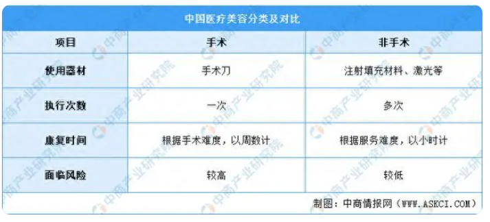醫(yī)療美容根據(jù)是否需要手術(shù),分為手術(shù)類和非手術(shù)類醫(yī)療美容,均是由經(jīng)注冊(cè)的專業(yè)醫(yī)師及醫(yī)療專家進(jìn)行。手術(shù)類醫(yī)療美容服務(wù)指的是通過(guò)手術(shù)對(duì)胸、鼻、眼皮及其他身體部位進(jìn)行侵入性地改變,旨在從根本上改變外觀。非手術(shù)類醫(yī)療美容服務(wù)又稱為微整形,主要包括注射療法和激光療法。