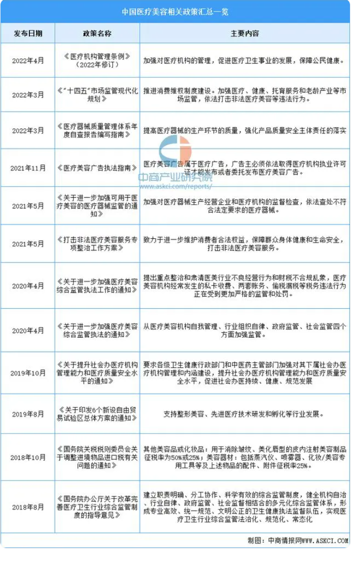 近年來(lái),國(guó)務(wù)院、國(guó)家衛(wèi)生部、商務(wù)部、國(guó)家食品藥品監(jiān)督管理總局等部門(mén)出臺(tái)了多項(xiàng)政策監(jiān)管細(xì)則,規(guī)范醫(yī)美行業(yè)。《醫(yī)療機(jī)構(gòu)管理?xiàng)l例》《醫(yī)療器械質(zhì)量管理體系年度自查報(bào)告編寫(xiě)指南》《醫(yī)療美容廣告執(zhí)法指南》《關(guān)于進(jìn)一步加強(qiáng)可用于醫(yī)療美容的醫(yī)療器械監(jiān)管的通知》等多項(xiàng)政策,明確醫(yī)療機(jī)構(gòu)、醫(yī)美醫(yī)師及醫(yī)美項(xiàng)目實(shí)施準(zhǔn)入要求管理,引導(dǎo)消費(fèi)者識(shí)別合法正規(guī)機(jī)構(gòu),防范不合規(guī)醫(yī)美機(jī)構(gòu)野蠻生長(zhǎng),促進(jìn)醫(yī)美行業(yè)健康有序發(fā)展。具體政策如下: