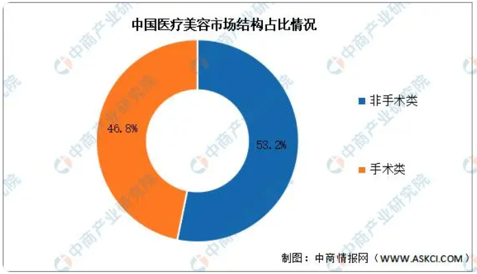 醫(yī)療美容是消費(fèi)行業(yè)中的黃金賽道,其中具有靈活、創(chuàng)傷小、恢復(fù)期短、風(fēng)險(xiǎn)低等特點(diǎn)非手術(shù)類的輕醫(yī)療美容發(fā)展迅速,2022年我國(guó)非手術(shù)類的輕醫(yī)療美容市場(chǎng)規(guī)模達(dá)1207億元,占整體市場(chǎng)的53.2%,手術(shù)類占比達(dá)46.8%。