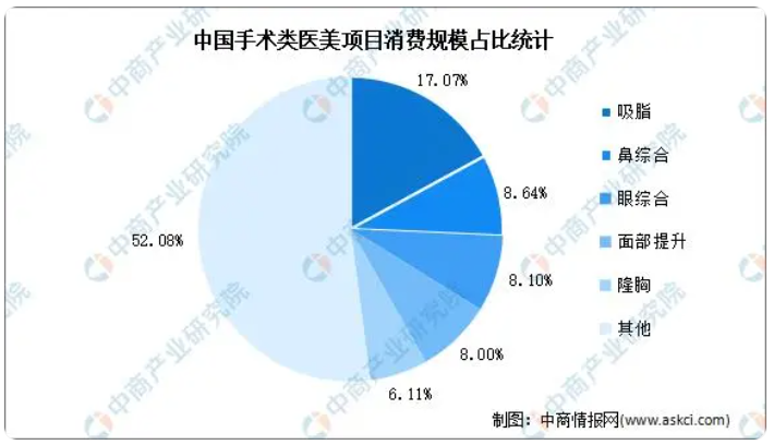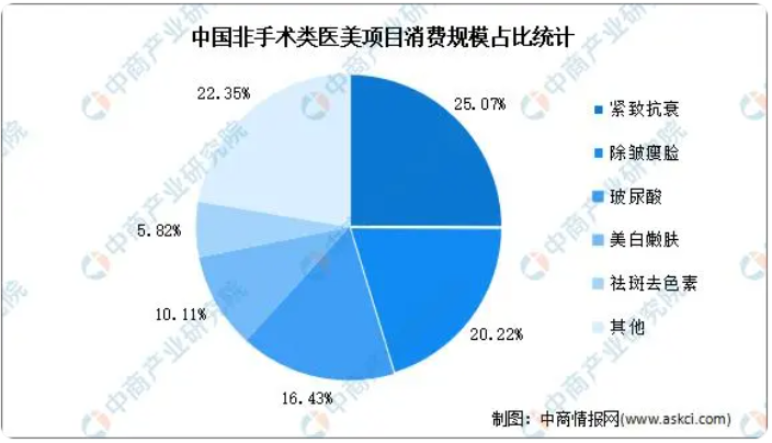從細(xì)分項(xiàng)目看,中國(guó)手術(shù)類項(xiàng)目前五分別為吸脂(占比17.07%)、鼻綜合(8.64%)、眼綜合(8.10%)、面部提升(8%)、隆胸(6.11%),非手術(shù)類項(xiàng)目前五分別為緊致抗衰(25.07%)、除皺瘦臉(20.22%)、玻尿酸(16.43%)、美白嫩膚(10.11%)、祛斑去色素(5.82%)。