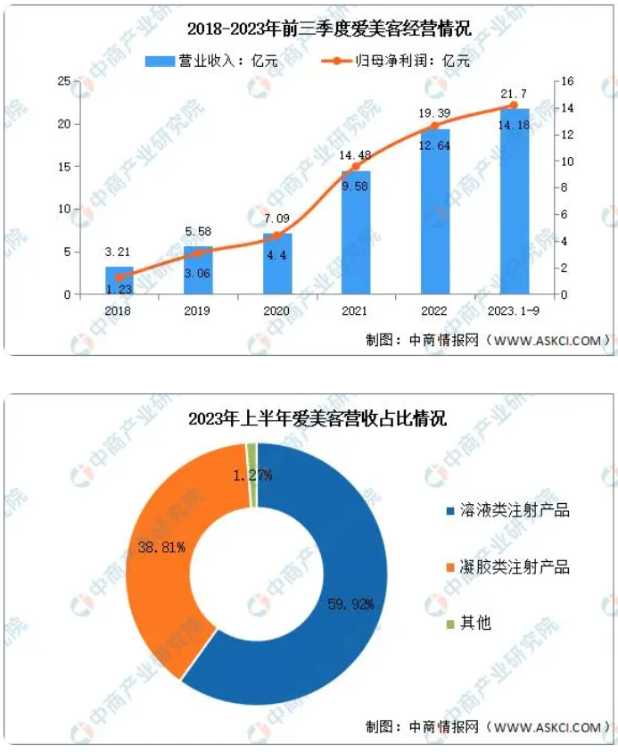 2023年前三季度實(shí)現(xiàn)營(yíng)業(yè)收入21.7億元,同比增長(zhǎng)45.74%;實(shí)現(xiàn)歸母凈利潤(rùn)14.18億元,同比增長(zhǎng)42.94%。2023年上半年主營(yíng)產(chǎn)品包括溶液類注射產(chǎn)品、凝膠類注射產(chǎn)品,分別占整體營(yíng)收的59.92%、38.81%。