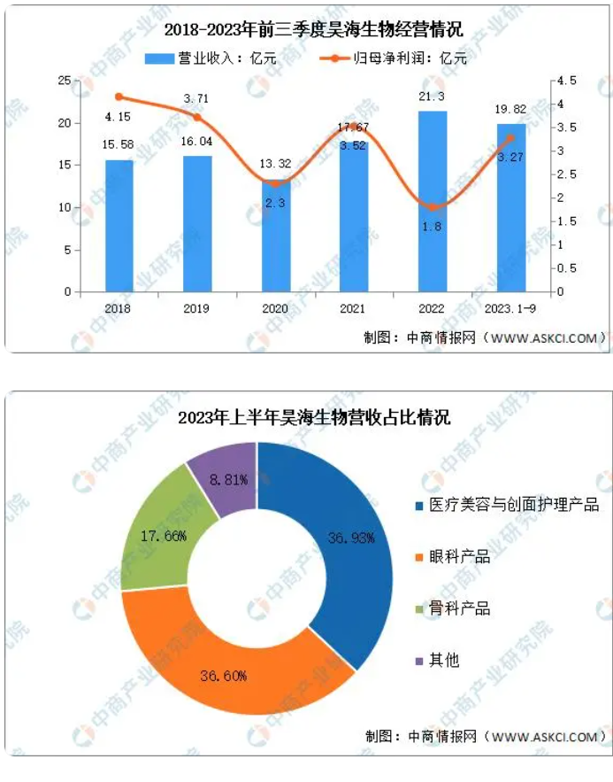 2023年前三季度實(shí)現(xiàn)營(yíng)業(yè)收入19.82億元,同比增長(zhǎng)25.21%;實(shí)現(xiàn)歸母凈利潤(rùn)3.27億元,同比增長(zhǎng)101.85%。2023年上半年主營(yíng)產(chǎn)品包括醫(yī)療美容與創(chuàng)面護(hù)理產(chǎn)品、眼科產(chǎn)品、骨科產(chǎn)品,分別占整體營(yíng)收的36.93%、36.60%、17.66%。