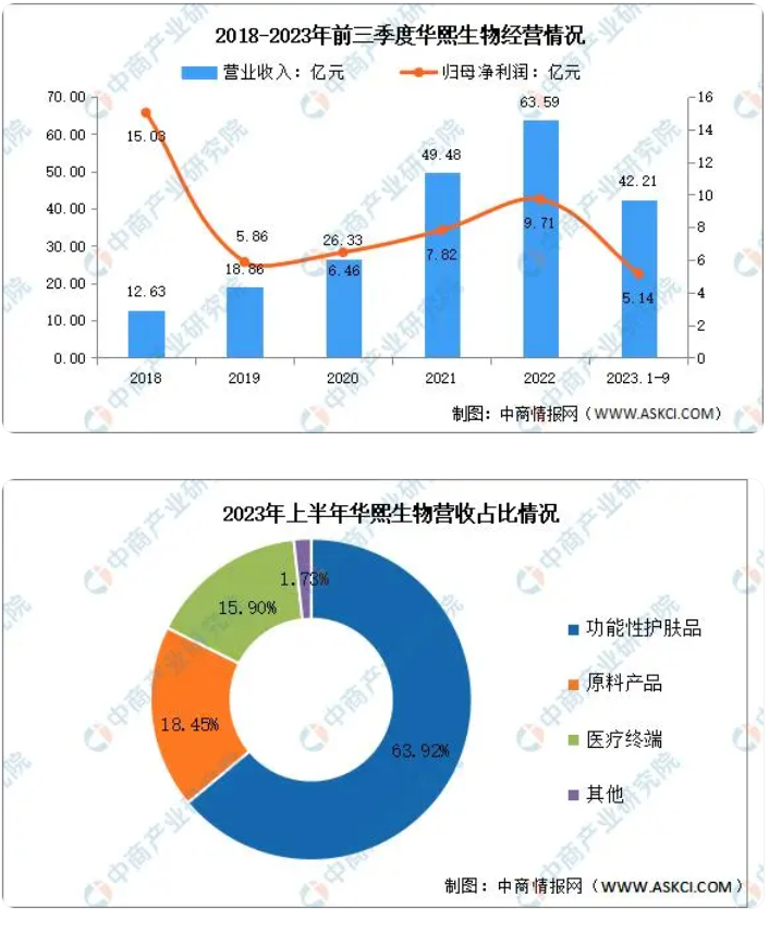 2023年前三季度實(shí)現(xiàn)營(yíng)業(yè)收入42.21億元,同比下降2.29%;實(shí)現(xiàn)歸母凈利潤(rùn)5.14億元,同比下降24.08%。2023年上半年主營(yíng)產(chǎn)品包括功能性護(hù)膚品、原料產(chǎn)品、醫(yī)療終端,分別占整體營(yíng)收的63.92%、18.45%、15.90%。