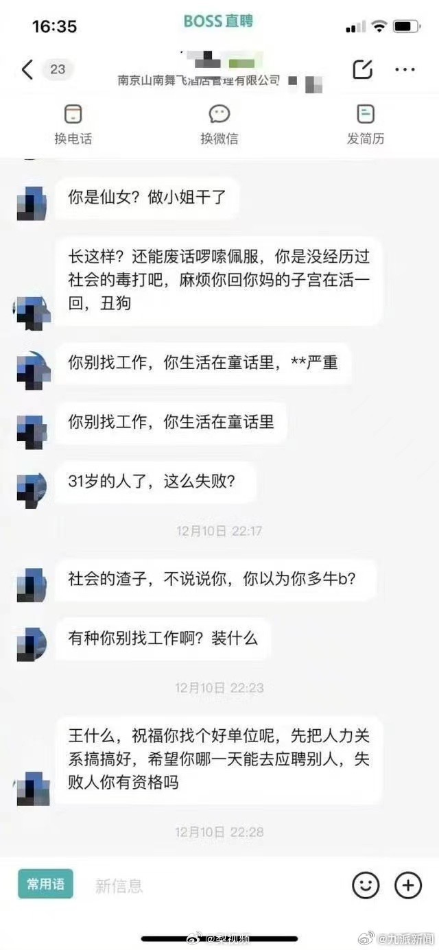 “無雙湖泊”告訴海報(bào)新聞?dòng)浾?,自己?2月10日晚在招聘平臺(tái)上應(yīng)聘工作地點(diǎn)為南京馬群美寓酒店的前臺(tái)崗位,在溝通待遇及休假情況時(shí),HR提到“保安月休一天,前臺(tái)頂上”?!盁o雙湖泊”隨后詢問“那過年(休假)呢?”,不料該HR竟稱“過年還要有假期,麻煩你找個(gè)公司給你無限放假”,并對(duì)她進(jìn)行了辱罵,稱她為“社會(huì)渣子”“弱智兒童”。