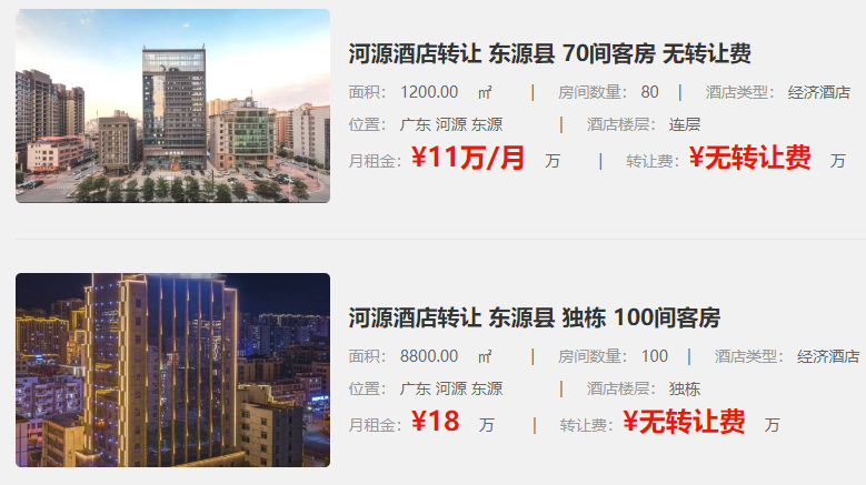據(jù)悉,這些尋求轉(zhuǎn)讓的酒店均位于河源市的不同城區(qū),包括源城區(qū)和紫金縣等。它們的房間數(shù)量從35間到100間不等,面積也從880㎡到8800㎡不同。這些酒店的月租金在¥2.7萬至¥18萬之間,其中大部分酒店的轉(zhuǎn)讓費均為無轉(zhuǎn)讓費,只有少數(shù)酒店的轉(zhuǎn)讓費為面議或具體數(shù)字。